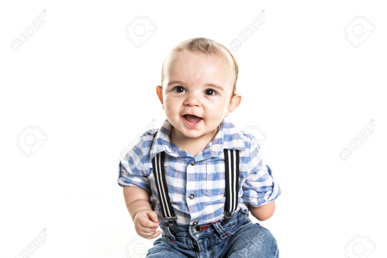 Cute Baby Boy With One Hand Over White Background Stock Photo