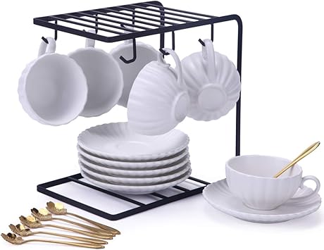 Jusalpha White China Tea Cup And Saucer Set With Holder Set Of 6
