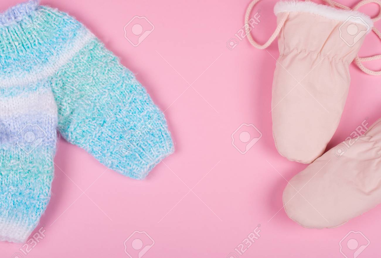 Baby Sweater Of Blue Color And Pink Baby Mittens On A Pastel