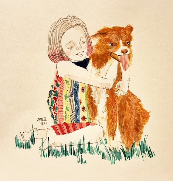 Animal Painting Dog And A Girl Watercolor Original By Ahnji Etsy